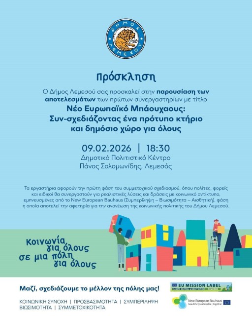 Ο Δήμος Λεμεσού σας προσκαλεί στην παρουσίαση των αποτελεσμάτων των πρώτων συνεργαστηρίων με τίτλο: «Νέο Ευρωπαϊκό Μπάουχαους: Συν-σχεδιάζοντας ένα πρότυπο κτήριο και δημόσιο χώρο για όλους» Δευτέρα 9 Φεβρουαρίου 2026 18:30 Δημοτικό Πολιτιστικό Κέντρο «Πάνος Σολομωνίδης»...