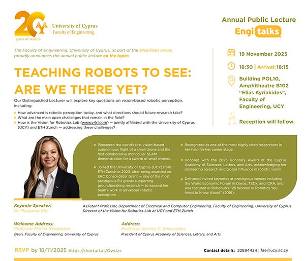 The Faculty of Engineering of the University of Cyprus, within the framework of its lecture series ENGiTalks, invites you to the annual public lecture entitled “Teaching Robotics to See: Are We There Yet?”. The lecture will take place on which will take place on Wednesday, 19 November 2025, at 18:30, at the new premises of the Faculty of Engineering on the University Campus (POL10, Amphitheatre B102 “Elias Kyriakides”).