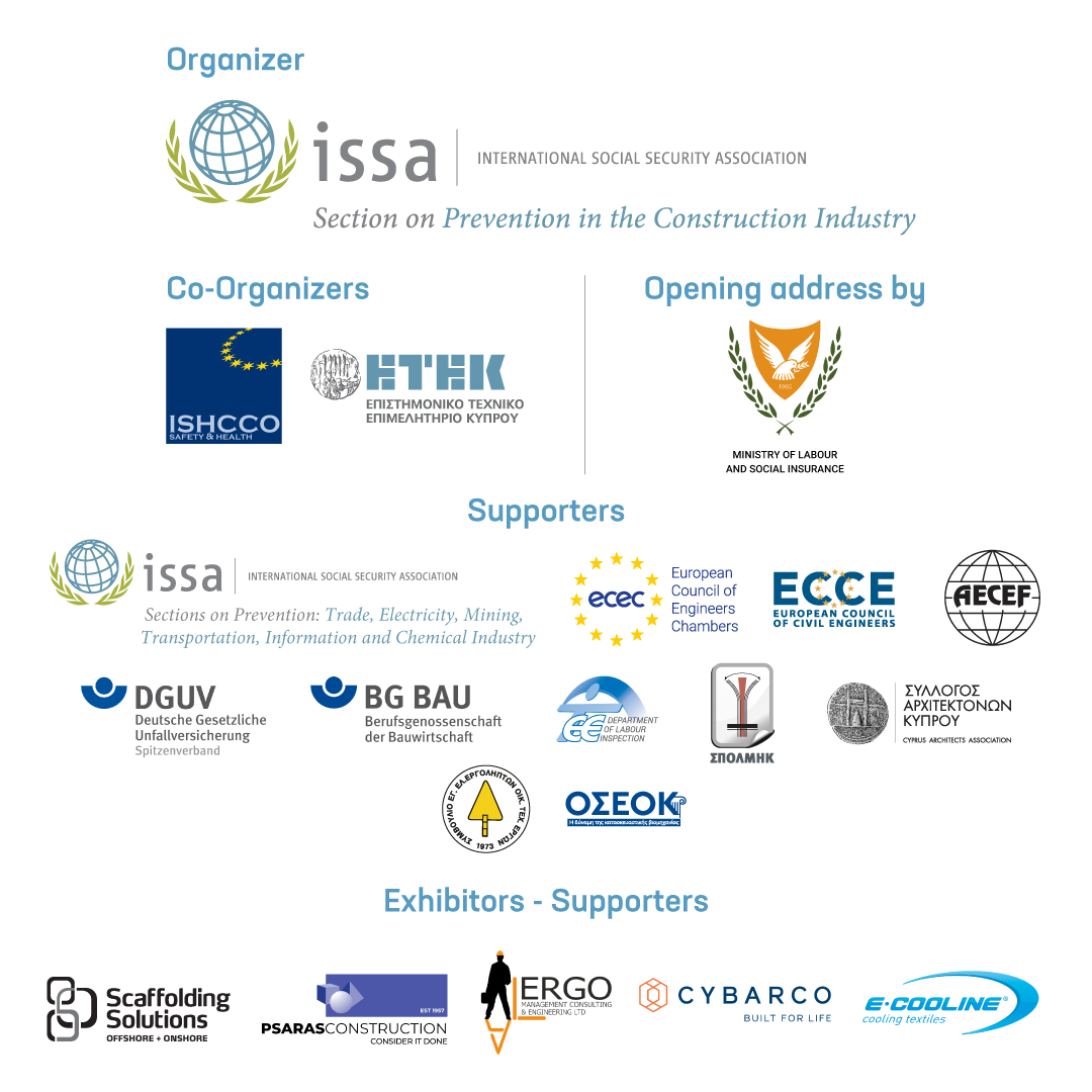 The conference is organized by the International Section of the ISSA on Prevention in the Construction Industry (ISSA Construction), with ISHCCO and ETEK as co-organisers and is supported by several organizations, including ISSA Sections on Prevention: Trade, Electricity, Mining, Transportation, Information and Chemical Industry, ECEC, ECEE, AECEF, DGUV, BG BAU, Department of Labour Inspection (ΤΕΕ), CYCAE (ΣΠΟΛΜΗΚ), Cyprus Architects Association (ΣΑΚ) and the Council of Contractors Registration and Control (CCRC - ΣΕΕΕ).