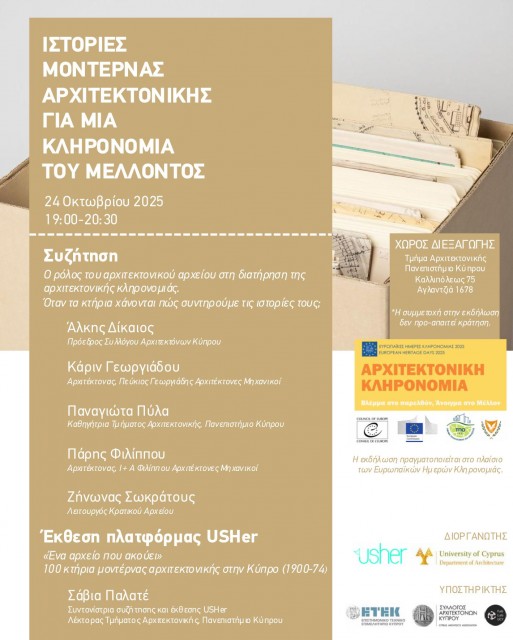 Με αφορμή τις Ευρωπαϊκές Ημέρες Κληρονομιάς 2025 που φέτος έχουν θέμα «Αρχιτεκτονική Κληρονομιά – Βλέμμα στο Παρελθόν, Άνοιγμα στο Μέλλον» θα πραγματοποιηθεί εκδήλωση στο Τμήμα Αρχιτεκτονικής, Πανεπιστήμιο Κύπρου στις 24 Οκτωβρίου 2025, 19:00. Όταν τα κτήρια "χάνονται" πώς μελετούμε, παράγουμε, και...