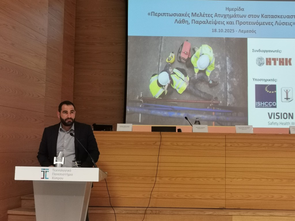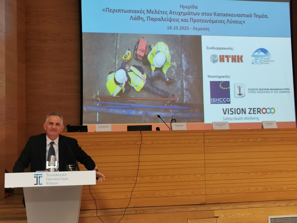 Με ιδιαίτερη επιτυχία ολοκληρώθηκε στις 18.10.2025 η ημερίδα ««Περιπτωσιακές Μελέτες Ατυχημάτων στον Κατασκευαστικό Τομέα. Λάθη, Παραλείψεις και Προτεινόμενες Λύσεις» στη Λεμεσό. Η ημερίδα συνδιοργανώθηκε από το ΕΤΕΚ και το Τμήμα Επιθεώρησης Εργασίας, με τη στήριξη του International Safety and Health Construction Coordinators Organization (ISHCCO) και του ΣΠΟΛΜΗΚ. Η ημερίδα εντάσσεται επίσης στις δραστηριότητες της εκστρατείας «Vision Zero».
