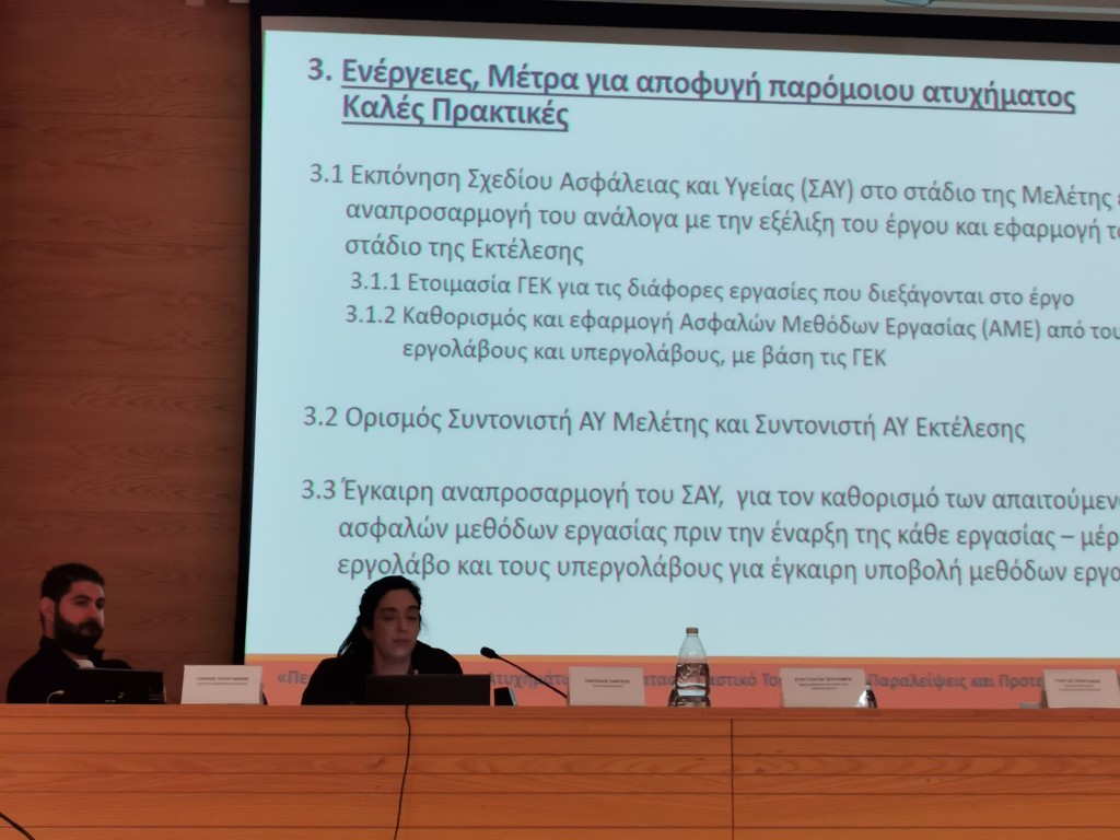 Στόχος της ημερίδας ήταν μέσα από την παρουσίαση περιπτωσιακών μελετών ατυχημάτων στον κατασκευαστικό τομέα, να κατανοηθούν λανθασμένες πρακτικές και παραλήψεις που οδήγησαν στην πρόκληση ατυχημάτων, προς αποφυγή παρόμοιων συμβάντων στο μέλλον. Μέσω της παρουσίασης των περιπτωσιακών μελετών ατυχημάτων και της συζήτησης που ακολούθησε, αναδείχθηκε η σημασία της εφαρμογής προληπτικών μέτρων για τη διασφάλιση θεμάτων ασφάλειας και υγείας στο εργοτάξιο, όπως η ετοιμασία και εφαρμογή κατάλληλων για την κάθε εργασία μεθοδολογιών εργασίας και γραπτών εκτιμήσεων κινδύνου, της χρήσης κατάλληλου εξοπλισμού εργασίας και της κατάλληλης και της τεκμηριωμένης εκπαίδευσης του προσωπικού που εργάζεται στο εργοτάξιο. Αναδείχθηκε επίσης το γεγονός ότι οι εμπλεκόμενοι σε ένα έργο, περιλαμβανομένου των Μηχανικών, έχουν πέραν της νομικής και ηθική υποχρέωση να εφαρμόζουν τις απαραίτητες διαδικασίες και να λαμβάνουν τα απαραίτητα μέτρα, ώστε να διασφαλίζεται πως ο κάθε εργαζόμενος επιστρέφει στο σπίτι του υγιής και αρτιμελής.