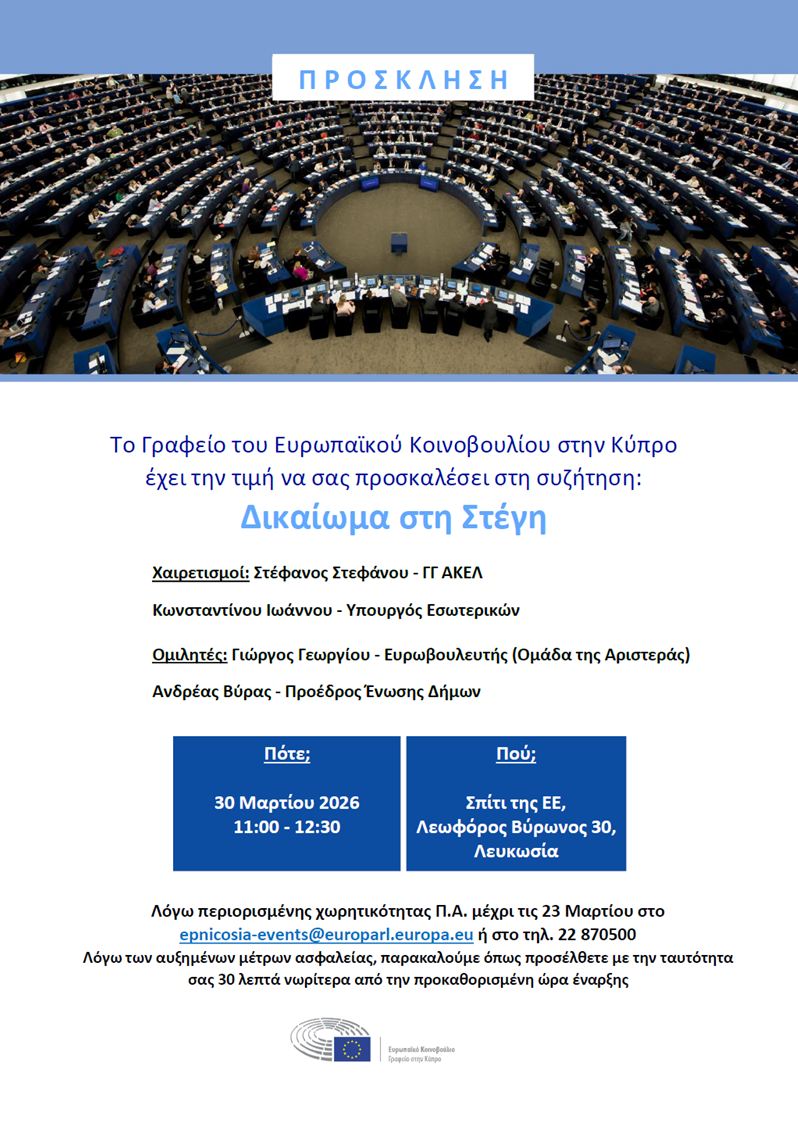 Γραφειο Ευρωπαϊκού Κοινοβουλίου στην Κύπρο-Συζήτηση με θέμα: Δικαίωμα στη στέγη, Παρασκευή 13/3/2026 στις 11πμ στο Σπίτι της ΕΕ, στη Λεωφορο Λόρδου Βύρωνος 30, Λευκωσία