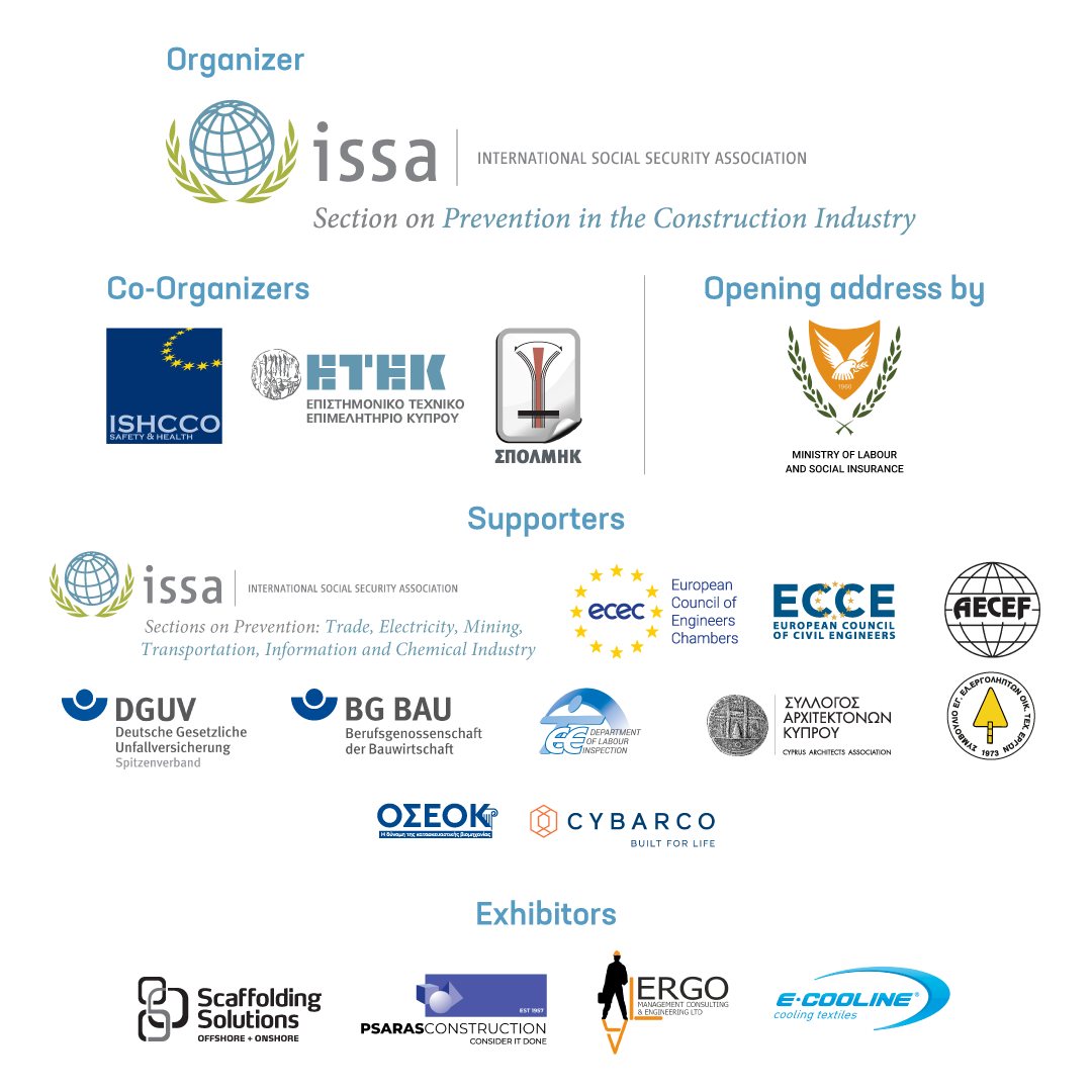 The conference is organized by the International Section of the ISSA on Prevention in the Construction Industry (ISSA Construction), with ISHCCO and ETEK as co-organisers and is supported by several organizations, including ISSA Sections on Prevention: Trade, Electricity, Mining, Transportation, Information and Chemical Industry, ECEC, ECEE, AECEF, DGUV, BG BAU, Department of Labour Inspection (ΤΕΕ), CYCAE (ΣΠΟΛΜΗΚ), Cyprus Architects Association (ΣΑΚ) and the Council of Contractors Registration and Control (CCRC - ΣΕΕΕ).