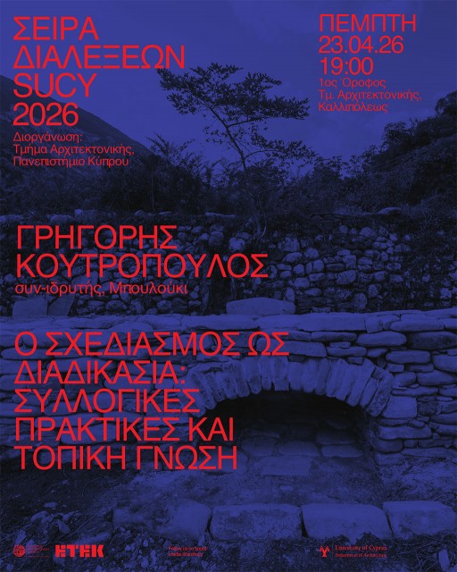 Μην χάσετε την πρώτη διάλεξη της σειράς Σεμιναρίων Αρχιτεκτονικής SUCY «ΤΟ ΔΙΕΥΡΥΜΕΝΟ ΠΕΔΙΟ ΤΗΣ ΑΡΧΙΤΕΚΤΟΝΙΚΗΣ»!    Προσκεκλημένος ομιλητής είναι ο Γρηγόρης Κουτρόπουλος (συν-ιδρυτής, Μπουλούκι) με θέμα «Ο Σχεδιασμός ως διαδικασία: συλλογικές πρακτικές και τοπική γνώση».   Η διάλεξη θα πραγματοποι...