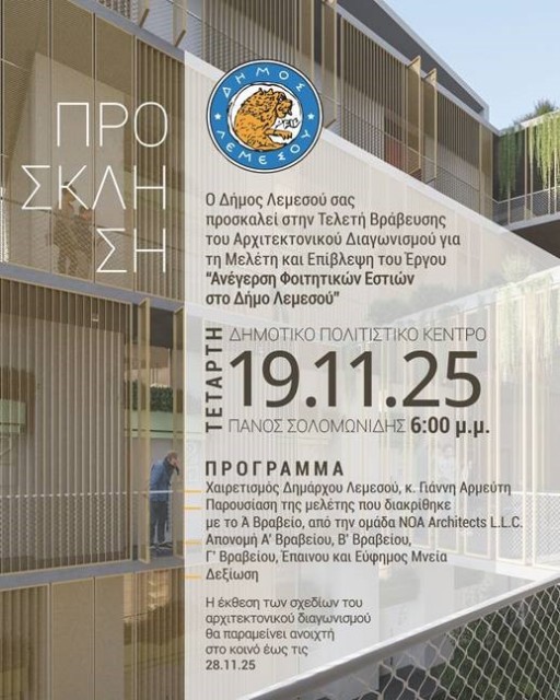Ο Δήμος Λεμεσού διοργανώνει Τελετή Βράβευσης στο πλαίσιο του Αρχιτεκτονικού Διαγωνισμού για τη Μελέτη και Επίβλεψη του έργου “Ανέγερση Φοιτητικών Εστιών”, ο οποίος προκηρύχθηκε στο πλαίσιο της στρατηγικής του Δήμου για την ενίσχυση της ποιότητας ζωής και της κοινωνικής συνοχής έως το 2030, με στόχο ...