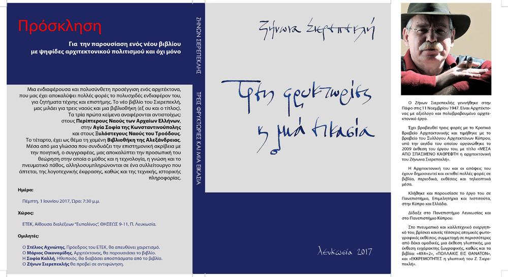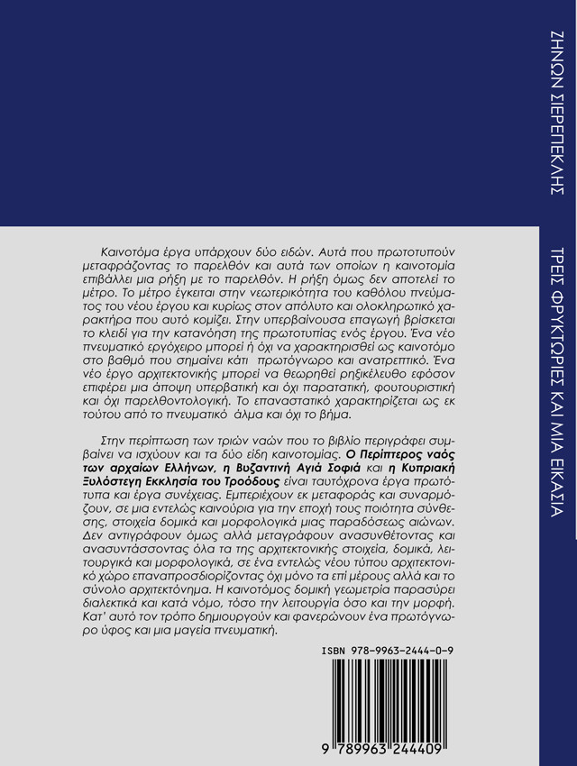 Μια ενδιαφέρουσα και πολυσύνθετη προσέγγιση ενός αρχιτέκτονα, που μας έχει αποκαλύψει πολλές φορές το πολυσχίδες ενδιαφέρον του για ζητήματα τέχνης και επιστήμης. Το νέο βιβλίο του αρχιτέκτονα, Ζήνων Σιερεπεκλή, μιλάει για τρεις ναούς και μια βιβλιοθήκη (εξ ου και ο τίτλος). Τα τρία πρώτα κείμενα αναφέρονται αντιστοίχως: στους Περίπτερους Ναούς των Αρχαίων Ελλήνων, στην Αγία Σοφία της Κωνσταντινούπολης και στους Ξυλόστεγους Ναούς του Τροόδους. Το τέταρτο, έχει ως θέμα την χαμένη Βιβλιοθήκη της Αλεξάνδρειας. Μέσα από μια γλώσσα που συνδυάζει την επιστημονική ακρίβεια με την ποιητική, ο συγγραφέας, αποκαλύπτει την προσωπική του θεώρηση μέσα στην οποία, ο μύθος και η τεχνολογία, η γνώση και το πνευματικό πάθος, αλληλοσυμπληρώνονται σε ένα συλλείτουργο που άπτεται της λογοτεχνικής έκφρασης, καθώς και της τεχνικής, ιστορικής πληροφορίας.