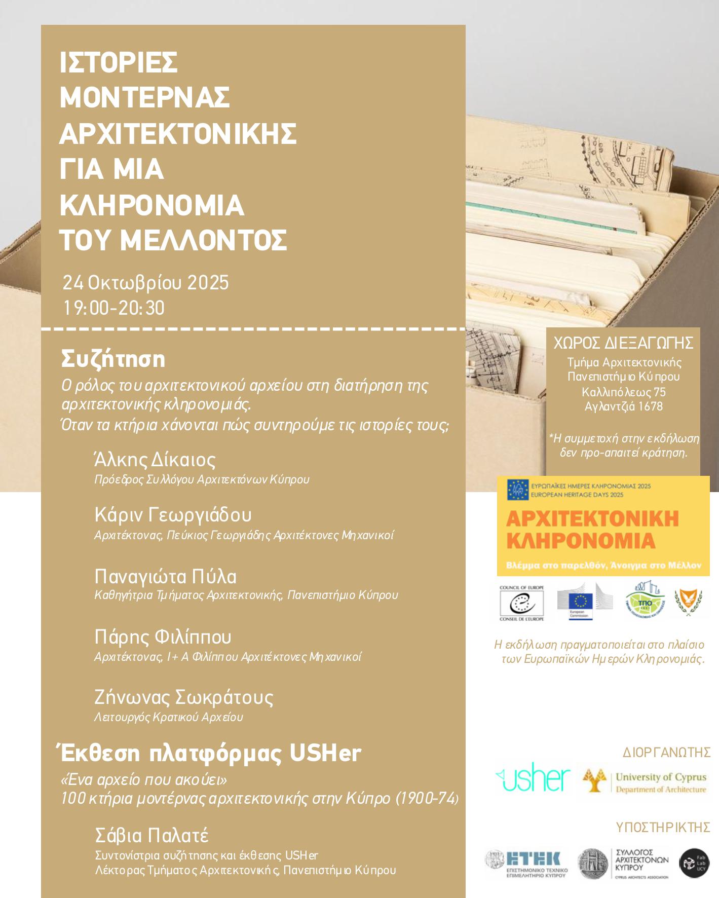 Η δράση υλοποιείται στο πλαίσιο των Ευρωπαϊκών Ημερών Κληρονομιάς 2025 με θέμα "Αρχιτεκτονική Κληρονομιά - Βλέμμα στο Παρελθόν, Άνοιγμα στο Μέλλον," και διοργανώνεται από το ερευνητικό πρόγραμμα USHer του Τμήματος Αρχιτεκτονικής, Πανεπιστήμιο Κύπρου σε συνεργασία με την επιτροπή του ΕΤΕΚ για την "Προστασία Κτηρίων του 20ου αιώνα."