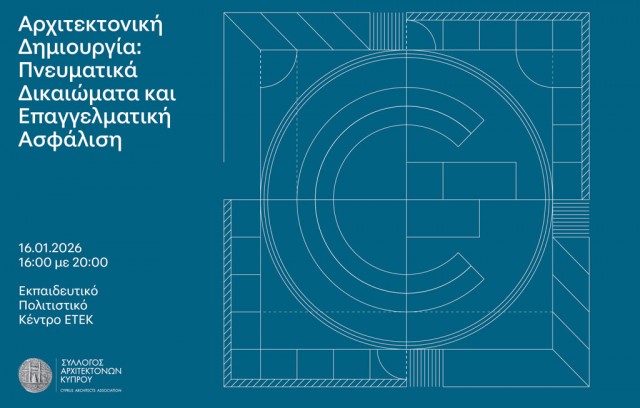 Ο Σύλλογος Αρχιτεκτόνων Κύπρου ανακοινώνει τη διοργάνωση σεμιναρίου με θέμα “Αρχιτεκτονική Δημιουργία: Πνευματικά Δικαιώματα και Επαγγελματική Ασφάλιση”, το οποίο θα πραγματοποιηθεί την Παρασκευή 16 Ιανουαρίου 2026, μεταξύ των ωρών 16:00 – 20:00, στο Εκπαιδευτικό Πολιτιστικό Κέντρο ΕΤΕΚ. Το σεμινάρ...