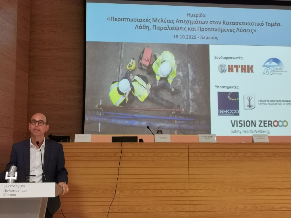 Με ιδιαίτερη επιτυχία ολοκληρώθηκε στις 18.10.2025 η ημερίδα ««Περιπτωσιακές Μελέτες Ατυχημάτων στον Κατασκευαστικό Τομέα. Λάθη, Παραλείψεις και Προτεινόμενες Λύσεις» στη Λεμεσό. Η ημερίδα συνδιοργανώθηκε από το ΕΤΕΚ και το Τμήμα Επιθεώρησης Εργασίας, με τη στήριξη του International Safety and Health Construction Coordinators Organization (ISHCCO) και του ΣΠΟΛΜΗΚ. Η ημερίδα εντάσσεται επίσης στις δραστηριότητες της εκστρατείας «Vision Zero».