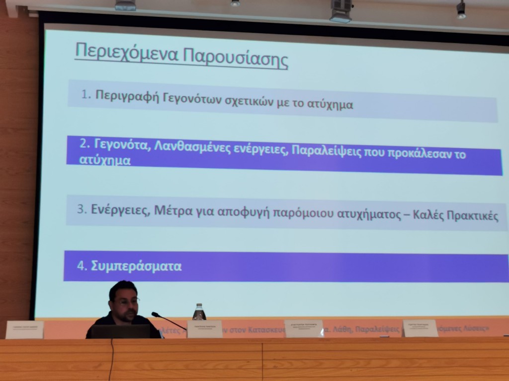 Στόχος της ημερίδας ήταν μέσα από την παρουσίαση περιπτωσιακών μελετών ατυχημάτων στον κατασκευαστικό τομέα, να κατανοηθούν λανθασμένες πρακτικές και παραλήψεις που οδήγησαν στην πρόκληση ατυχημάτων, προς αποφυγή παρόμοιων συμβάντων στο μέλλον. Μέσω της παρουσίασης των περιπτωσιακών μελετών ατυχημάτων και της συζήτησης που ακολούθησε, αναδείχθηκε η σημασία της εφαρμογής προληπτικών μέτρων για τη διασφάλιση θεμάτων ασφάλειας και υγείας στο εργοτάξιο, όπως η ετοιμασία και εφαρμογή κατάλληλων για την κάθε εργασία μεθοδολογιών εργασίας και γραπτών εκτιμήσεων κινδύνου, της χρήσης κατάλληλου εξοπλισμού εργασίας και της κατάλληλης και της τεκμηριωμένης εκπαίδευσης του προσωπικού που εργάζεται στο εργοτάξιο. Αναδείχθηκε επίσης το γεγονός ότι οι εμπλεκόμενοι σε ένα έργο, περιλαμβανομένου των Μηχανικών, έχουν πέραν της νομικής και ηθική υποχρέωση να εφαρμόζουν τις απαραίτητες διαδικασίες και να λαμβάνουν τα απαραίτητα μέτρα, ώστε να διασφαλίζεται πως ο κάθε εργαζόμενος επιστρέφει στο σπίτι του υγιής και αρτιμελής.